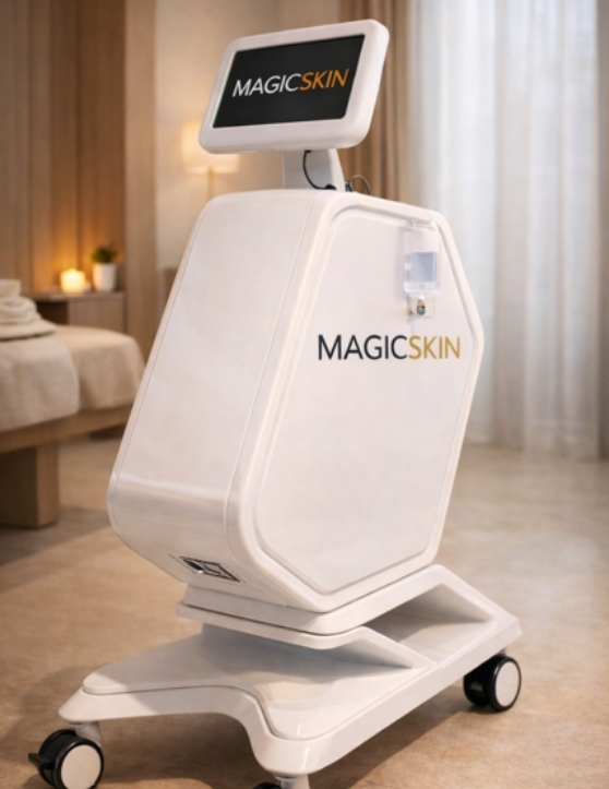 Selon l’inclinaison de la pièce à main et de sa distance avec la peau, MAGIC SKIN va réaliser un traitement complet de la zone traitée (visage, décolleté, corps).
