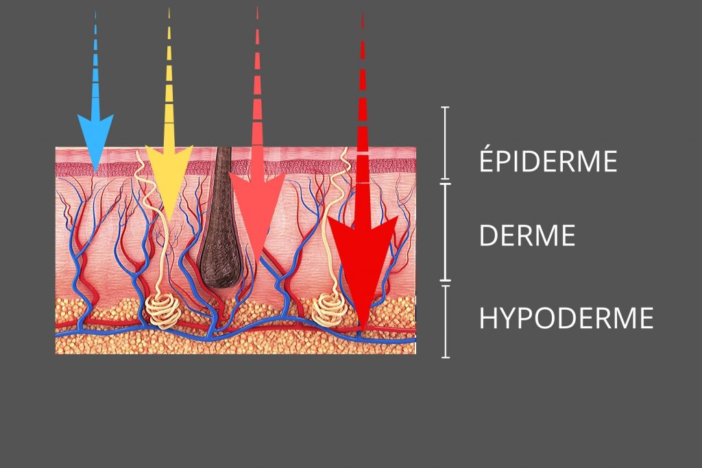 La pénétration des rayons de lumière LED dans les différentes couches de la peau dépend de leur longueur d’onde.